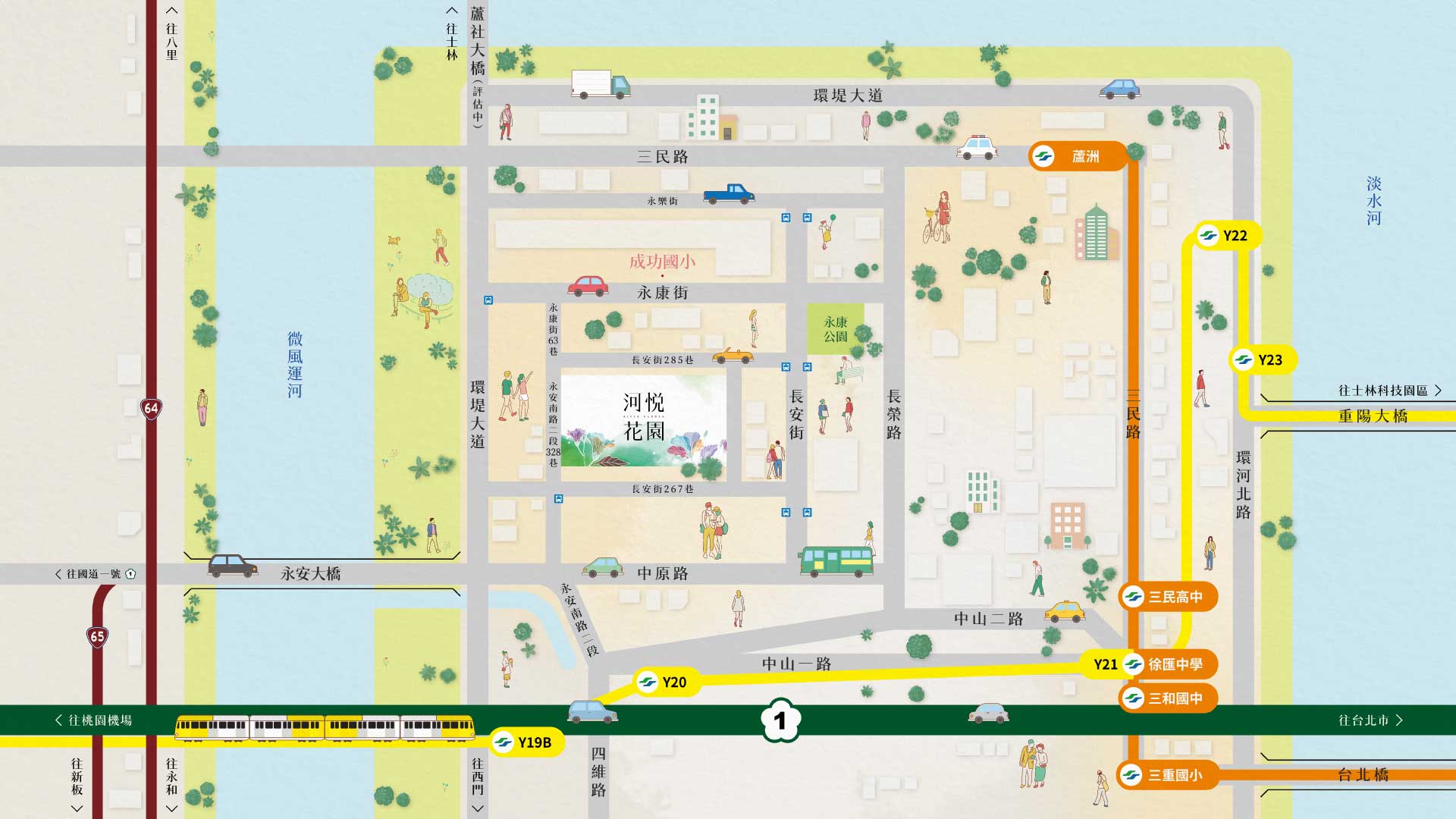 自行車步道隨風啟程,散步漫遊、野餐賞景、親子共遊,是新北居民休閒的好去處,更是老少閒宜的河岸廊道。河悅花園位於”微風運河區”的正前方,近取河岸優雅微風。