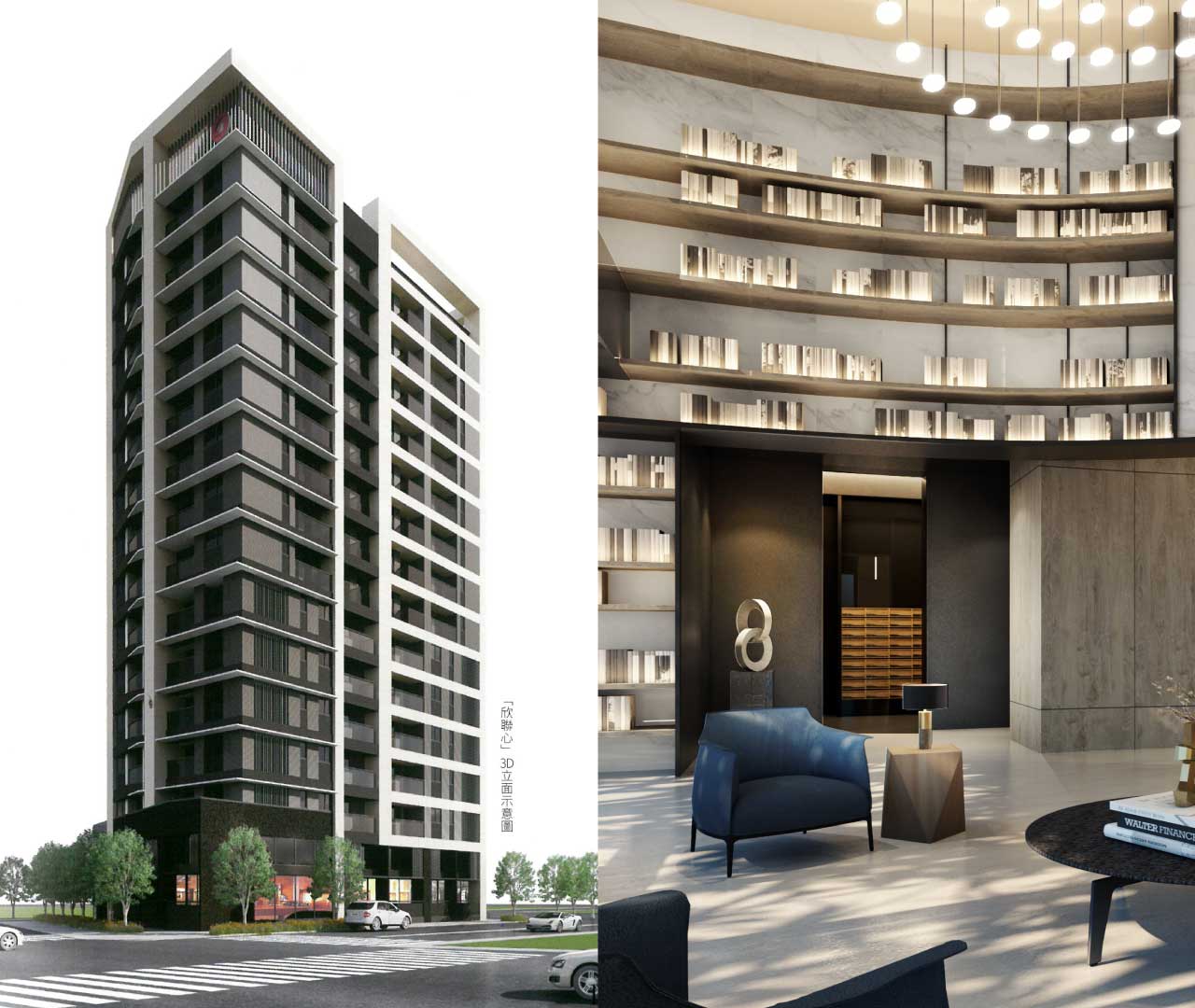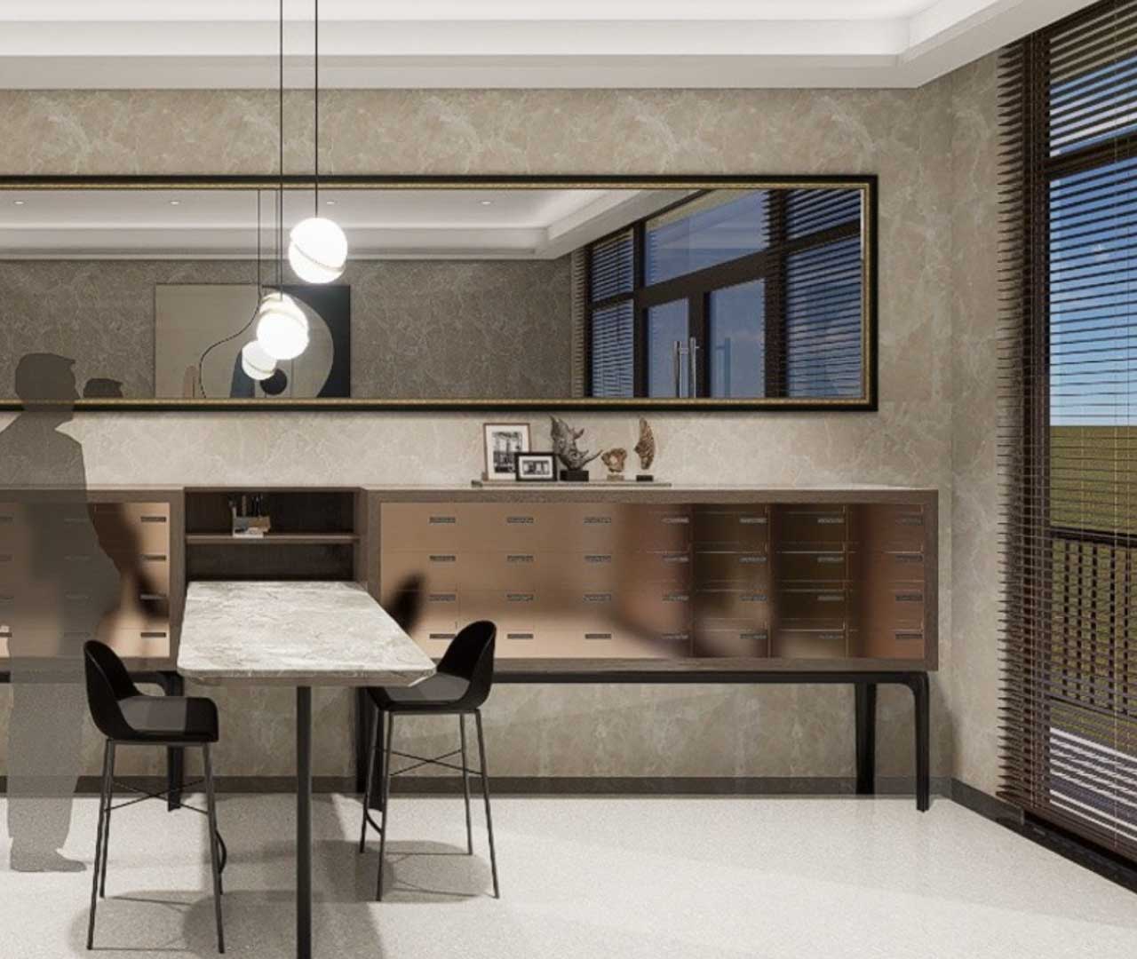 結晶玻璃、石材與米色外牆磚,展現出人與自然的和諧,打造出安逸宜居的河岸地標。